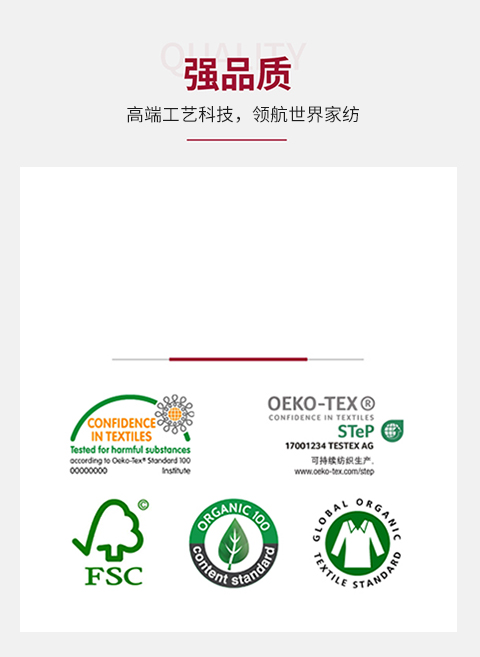 凭借优质的产品和良好的信誉,公司通过Oeko-Tex Standard 100、OCS、GOTS认证、FSC森林认证、STeP可持续纺织生产最高级认证(全球仅有100多家企业获得)。