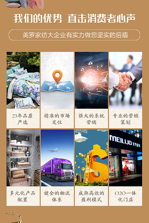 现在加盟美罗家纺享9大优惠加盟支持!免费获取详细加盟优惠政策、加盟条件、产品图册、投资详情资料,敬请留言或电话垂询。