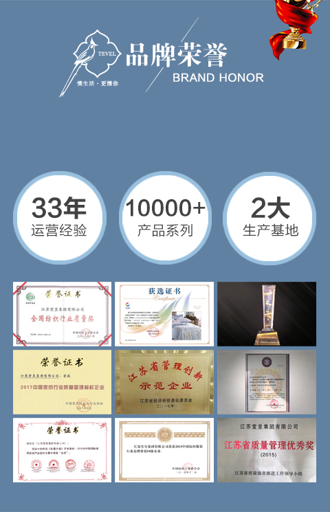堂皇家纺创建于1986年。作为中国家纺行业协会副会长单位,堂皇一直致于为人们提供健康,舒适,有品位的居家生活,为亿万家庭带来高品质优雅舒适的生活体验。